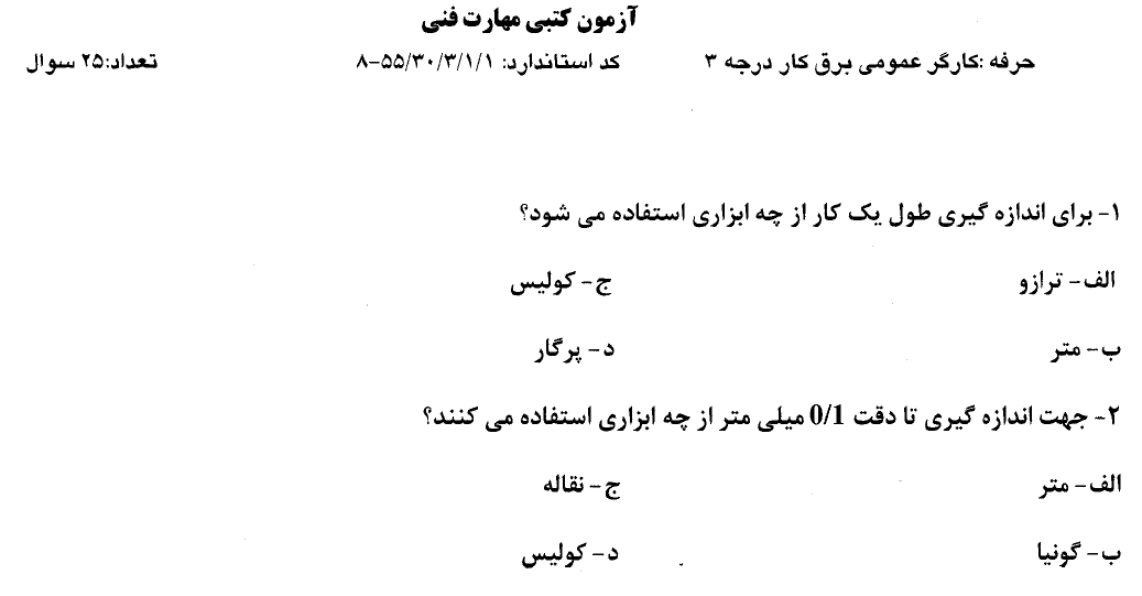 صفحه محصول - سوالات آزمون پایان دوره برقکار عمومی درجه 3 - 6 صفحه - pdf